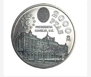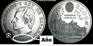 Moneda conmemorativa de plata de 2000 pesetas del año 1995. 2 Mon= 84 € 3 Mon= 120€ 4 Mon= 148€ - Anverso: Retrato de Juan Carlos I Rey de España. - Reverso: Palacio Real de Madrid, PRESIDENCIA CONSEJO U.E., 2000 PTAS y e con estrellas.