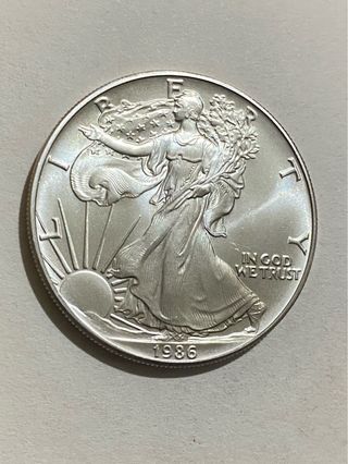 Moneda de plata American Silver Eagle de 1 onza troy, con fecha de 1986. - Diseño de la Libertad caminando. - In God We Trust grabado. Moneda escasa al ser el 1 año de la serie liberty... ademas esta en perfecto estado con su brillo original precioso