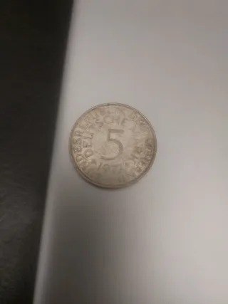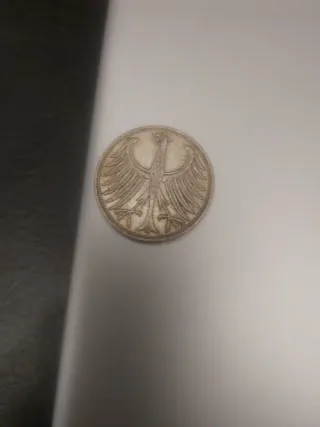 Moneda de 5 marcos alemanes del año 1972. - Diseño de águila. - Borde con detalles. - Acabado plateado.