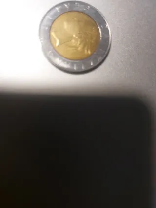 Moneda conmemorativa de 500 liras italianas del año 1985. - Diseño bimetálico con borde plateado y centro dorado. - Detalle del perfil de un personaje histórico en el anverso.