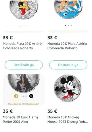 Lote de 4 monedas de 10 euros. - Moneda 10€ Plata Astérix Coloreada Roberto. - Moneda 10 Euro Harry Potter 2021 Alex. - Moneda 10€ Mickey Mouse 2023 Disney - moneda 10 euros Obelix