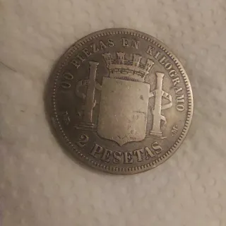 Moneda de 2 pesetas de plata del año 1870. - Diseño con escudo y corona. - Inscripción 100 PIEZAS EN KILOGRAMO y 2 PESETAS. Plata 10 gr.
