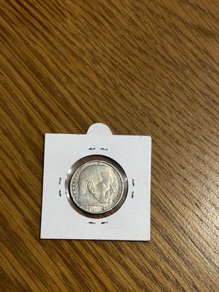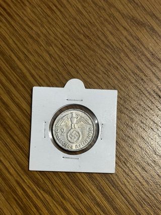 Moneda de 2 Reichsmark Paul Von Hindenburg de la Alemania de 1938. Presenta un águila imperial y el escudo. - Año: 1938 - Denominación: 2 Reichsmark - País: Alemania