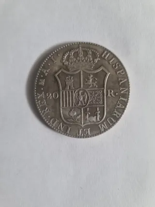 COPIA. Moneda de 20 Reales del año 1859. Presenta un diseño detallado con escudo y corona. - Canto con inscripción 20 REALES. - Diseño de REINA DE LAS ESPAÑAS en el anverso.