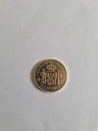 Réplica de moneda de 1 peso de las Islas Filipinas, acuñada en 1897. - Diseño con escudo y corona. - Inscripción ISLAS FILIPINAS y UN PESO.