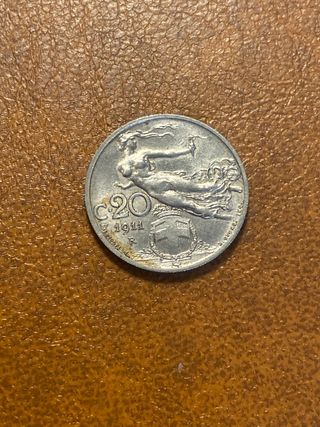 Moneda de 20 Centesimi de Italia, año 1911. - Diseño con figura femenina. - Escudo de Italia. - Grabado R en la parte inferior.