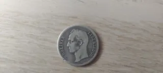 Moneda de 1 Bolívar de plata de 1945. Con la efigie de Simón Bolívar y la leyenda "Bolívar libertador" en una de sus caras y el escudo de los Estados Unidos de Venezuela en el otro. - Peso: 5 gramos. - Ley: 835.