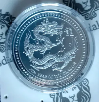 Forma parte de la serie "Lunar New Year" inspirada en el calendario lunar chino. El año 2024 pertenece al dragón. Como una de las criaturas más veneradas e icónicas de la cultura china, se cree que el dragón simboliza la fuerza, la suerte y la prosperidad. El reverso presenta una imagen del dragón junto con las inscripciones: "YEAR OF THE DRAGON" y "2024". En el anverso, encontrará el escudo de armas de Samoa junto con información sobre el país emisor, año de acuñación, prueba de metal y valor nominal. Onzas de peso, 62,2 gramos de plata pura 999. En su cápsula original y sellada de fábrica. Tirada: 888 monedas. Tengo varias. Ref20