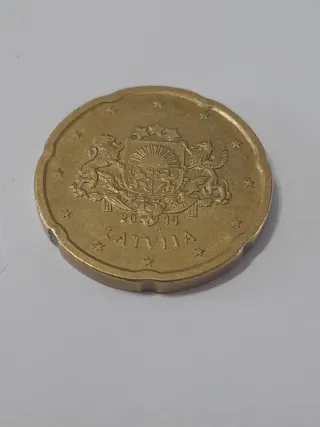 Moneda de 20 céntimos de Letonia del año 2014. - Diseño del escudo de Letonia. - Borde con estrellas.