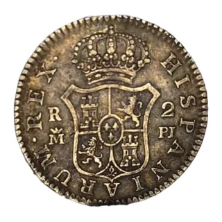 Moneda de plata con diseño detallado. - Grabado de escudos y cañones. - Inscripción HISPAN y REX.