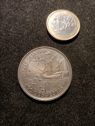 Moneda conmemorativa de Portugal, de 100 escudos, acuñada en 1980. - Diseño dedicado al Archipiélago de los Azores. - Representa un barco de vela y una rosa de los vientos. - Inscripción: ARQUIPELAGO DOS ACORES 1427-1452 y 1439-1989.