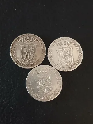 Conjunto de ocho monedas de plata españolas. De Isabel II. - 3 monedas de 40 céntimos de Escudo. Años 1866, 1867, 1868. - 2 monedas de 2 reales. años 1852 y 1863 - 3 monedas de 1 real. años. 1852, 1859, 1862. Entrega en mano en Madrid. Posibilidad de envio certificado. Seriedad absoluta.