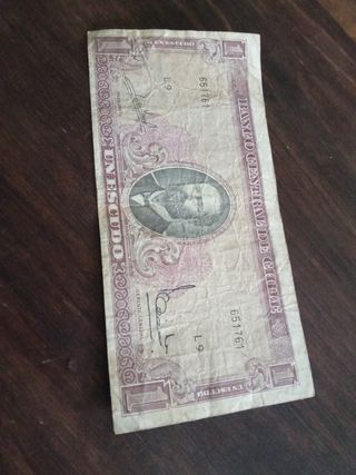 Billete circulado de un escudo chileno "L9" en condiciones aceptables. Las fotos forman parte de la descripción.