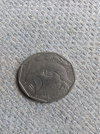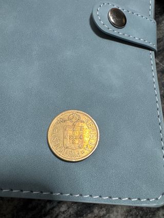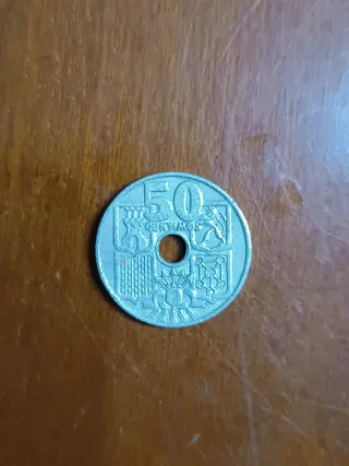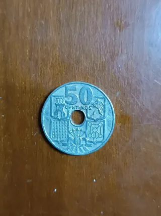 Moneda antigua de 50 céntimos con un diseño clásico. - Diseño con escudos y un agujero central. - Material metálico.