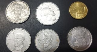 Colección de 14 monedas antiguas de diferentes países. BÉLGICA: 1 franco belga de 1989, 5 francos de 1962, 5 f. de 1986, 20 f. de 1981 y 50 f. de 1986. ITALIA: 20 liras de 1986, 50 l. de 1976 y 100 l. de 1978. ARGENTINA: 1 peso de 1974 FRANCIA: 1 franco de 1977 y 20 céntimos de 1970. PORTUGAL: 5 escudos de 1975 y 20 escudos de 1986. MARRUECOS: 1 dirham de 1974.