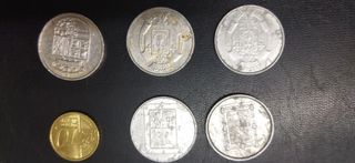 Conjunto de seis monedas antiguas de España, con diferentes diseños y años. - Dos monedas plateadas con el perfil de Juan Carlos I y Rey de España. - Dos monedas cobrizas con el perfil de Juan Carlos I. - Una moneda cobriza con un diseño de un barco. - Una moneda plateada con un escudo.