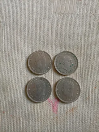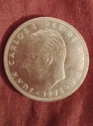 Se venden dos monedas antiguas españolas. Una es de 100 pesetas, con detalles de la corona y escudos. La otra muestra el perfil del rey Carlos I. Ambas monedas parecen estar en buen estado de conservación. - Moneda de 100 pesetas. - Moneda con la efigie de Carlos I Rey de España. - Piezas antiguas.