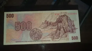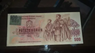 Billete de 500 Korún de Checoslovaquia del año 1973. - Diseño con figuras de soldados y un escudo. - Texto PÄŤSTO KORÚN ČESKOSLOVENSKÝCH y FALŠOVANIE SA TRESCE PODĽA ZÁKONA. - Número de serie SNP 1944.