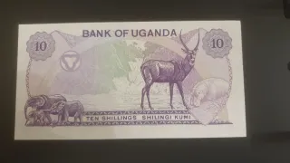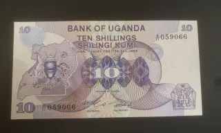 Billete de 10 chelines de Uganda, emitido por el Banco de Uganda. - Diseño con el mapa de Uganda y el escudo nacional. - Texto Legal Tender for Ten Shillings y Shilingi Kumi. - Número de serie: 059066.