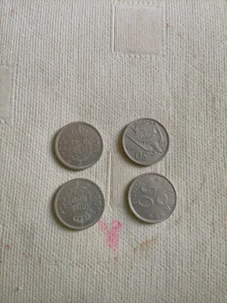 Lote de cuatro monedas de 50 pesetas de España. - Diseño con escudo. - Valor: 50 pesetas. - País: España.