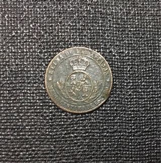 Moneda antigua con detalles grabados. - Diseño con escudo central. - Inscripciones en el borde.