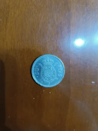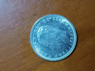 Moneda de 5 pesetas con el busto del Rey. - Canto con inscripción. - Diseño detallado del escudo de España.
