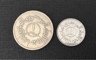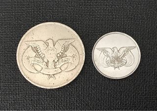 Conjunto de dos monedas de Yemen con el escudo nacional. 1 rial 1976 1 rial 1993