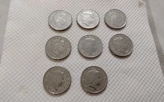 Conjunto de ocho monedas de 10 peniques del Reino Unido. - Diseño con el escudo real. - Acuñadas en metal plateado.