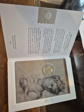 Moneda conmemorativa de 2 euros de San Marino del año 2025, dedicada a Miguel Ángel. - Conmemora el 550 aniversario del nacimiento de Michelangelo. - Edición Fior di Conio (sin circular). - Incluye el escudo de la República de San Marino y la Secretaría de Estado de Finanzas y Presupuestos.