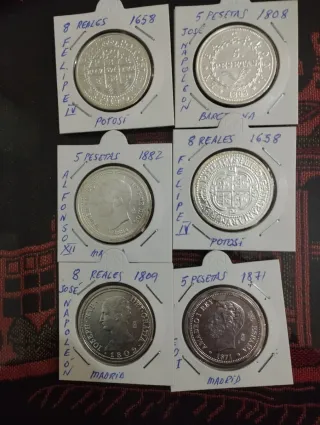 Conjunto de réplicas de monedas españolas. - Réplica de 8 Reales de 1658 (Felipe IV, Potosí). - Réplica de 5 Pesetas de 1808 (José Napoleón, Barcelona). - Réplica de 5 Pesetas de 1882 (Alfonso XII, Madrid). - Réplica de 8 Reales de 1658 (Felipe IV, Potosí). - Réplica de 8 Reales de 1809 (José Napoleón, Madrid). - Réplica de 5 Pesetas de 1871 (Amadeo I, Madrid).