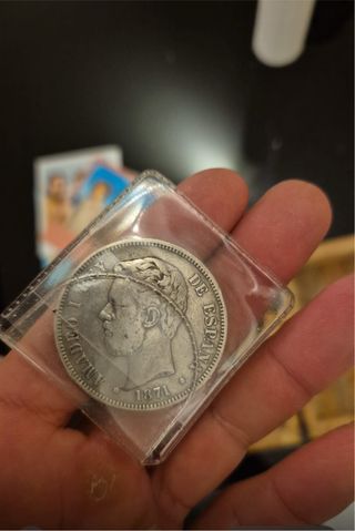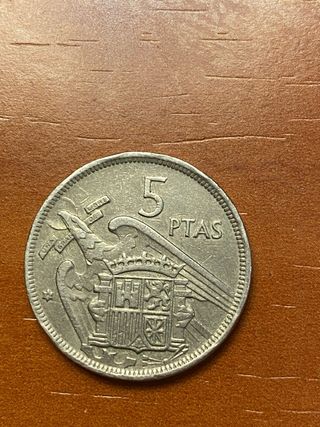 La moneda es una moneda de 5 pesetas de 1949 del Estado Español, con la efigie de Francisco Franco. Estas son sus características principales: Material: Níquel. Valor nominal: 5 pesetas (popularmente conocidas como "duros"). Anverso: Muestra el busto del general Franco y la inscripción "FRANCISCO FRANCO CAUDILLO DE ESPAÑA POR LA G DE DIOS 1949". Valor de mercado: Las monedas de 1949 con las estrellas que marcan el año exacto de acuñación (visible en el reverso, no en esta imagen) pueden tener un valor significativo para coleccionistas, alcanzando precios altos en subastas si están en perfecto estado.