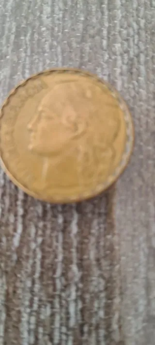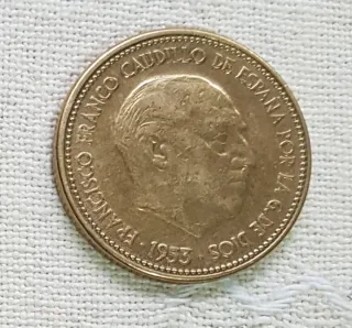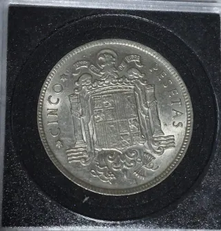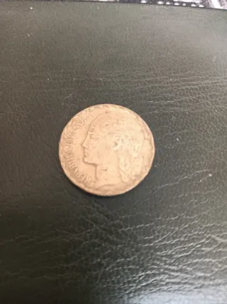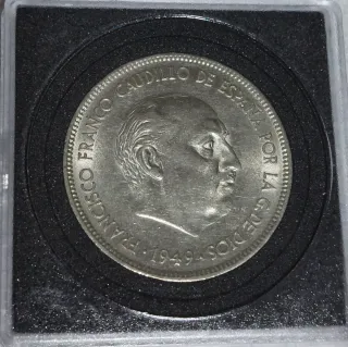 La moneda es una moneda de 5 pesetas de 1949 del Estado Español, con la efigie de Francisco Franco. Estas son sus características principales: Material: Níquel. Valor nominal: 5 pesetas (popularmente conocidas como "duros"). Anverso: Muestra el busto del general Franco y la inscripción "FRANCISCO FRANCO CAUDILLO DE ESPAÑA POR LA G DE DIOS 1949". Valor de mercado: Las monedas de 1949 con las estrellas que marcan el año exacto de acuñación (visible en el reverso, no en esta imagen) pueden tener un valor significativo para coleccionistas, alcanzando precios altos en subastas si están en perfecto estado. Contexto: La producción de