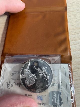 Moneda conmemorativa de la Copa del Mundo de Fútbol celebrada en España en 1982. - Diseño con balón de fútbol y banda. - Inscripción ESPAÑA 82 COPA DEL MUNDO. - Sello RFEF (Real Federación Española de Fútbol). -Conmemoración campeón Argentina 1978.