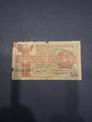 Billete de 1 peseta de la República Española, emitido en 1937. - Certificado provisional de moneda divisionaria. - Diseño con figura alegórica y escudo de España. - Número de serie A9427927.