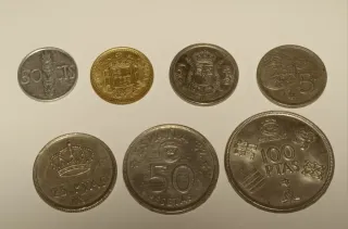 Lote de 7 monedas españolas de Juan Carlos I. - Incluye monedas de diferentes años y valores. - Diseño con el busto del rey Juan Carlos I. - Grabado JUAN CARLOS I REY DE ESPAÑA. - Uso monetario, 0,50-1-5-25-50-100 pesetas Circuladas