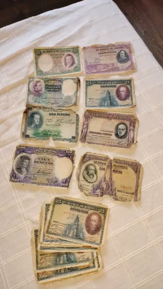 Lote de billetes españoles de pesetas de diferentes años. Precio asequible para gente coleccionista. Preguntar sin compromiso 😉🤗😊 - Billetes de 25 pesetas. - Año de emisión: 1931. - Incluye billetes de los años 1925, 1928, 1931 y 1935.