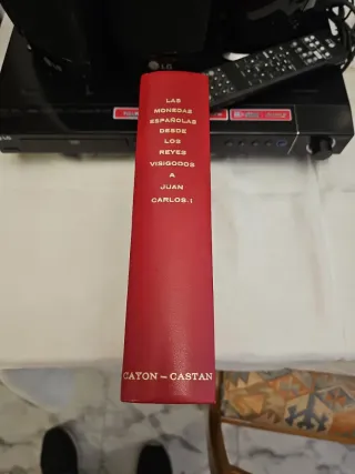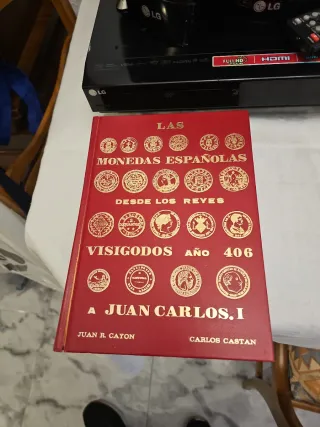 Libro sobre la historia de las monedas españolas, centrado en la época visigoda. - Título: Las Monedas Españolas Desde Los Reyes Visigodos Año 406 - Autores: Juan R. Cayón y Carlos Castán - Cubierta roja con detalles dorados.