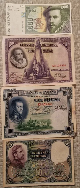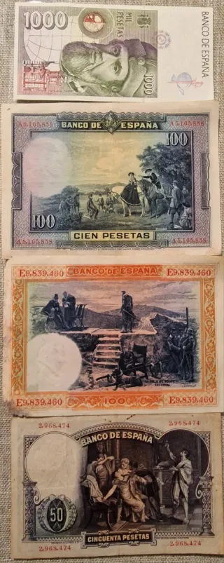 Billetes España 1000, 100, 50 Pesetas + Lira Itali