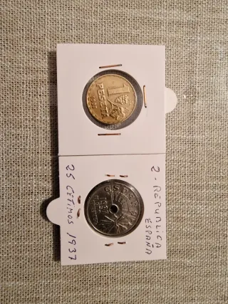 Lote de dos monedas españolas del año 1937. - Una moneda de 1 peseta. - Una moneda de 25 céntimos.
