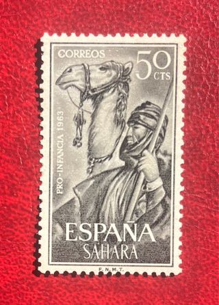 Bonita serie de 3 sellos del Sahara español emitidos por la Fábrica Nacional de Moneda y Timbre ( FNMT ) en 1963 pro Infancia. Esto significaba que parte del franqueo postal que se pagaba con estos sellos para el Correo entre la Península y el Sahara era destinado a las ayudas del Estado dirigidas a los niños necesitados del país. Esta serie de 3 sellos de 25 céntimos, 50 céntimos y una Peseta presentan unas bonitas imágenes de camellos y hombres del desierto del Sahara, los famosos beduinos nómadas.