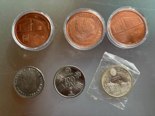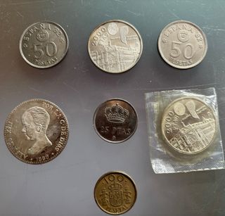 Conjunto de monedas españolas para coleccionistas. - Moneda de 50 pesetas de 1982. - Moneda de 25 pesetas con corona. - Moneda de 100 pesetas con escudo. - Moneda de 2000 pesetas conmemorativa de Madrid. - Moneda de 50 pesetas de 1982 (otra unidad). - Moneda de 2000 pesetas conmemorativa de Madrid (en plástico).