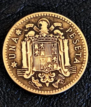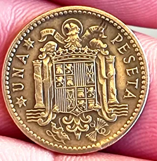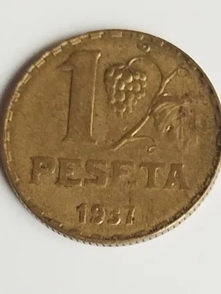 Moneda de 1 peseta de la República Española, acuñada en el año 1937. - Diseño con el número 1 y una rama de vid con uvas. - Inscripción PESETA y el año 1937.