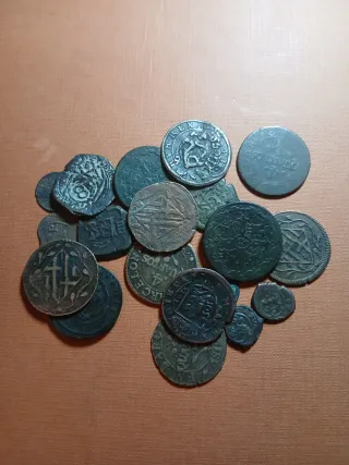 Conjunto de monedas antiguas de origen español. Presentan un aspecto desgastado por el paso del tiempo. - Monedas de diferentes tamaños y diseños. - Materiales variados, con pátina verde característica.