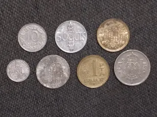Lote de monedas antiguas españolas, incluyendo pesetas y céntimos de diversas épocas. - Monedas de 25 pesetas. - Monedas de 50 pesetas. - Monedas de 50 céntimos. - Monedas de 1 peseta. - Monedas de 5 pesetas. - Años visibles: 1947, 1949, 1953, 1957, 1959, 1963, 1966, 1975, 1980, 1982, 1983, 1984, 1988, 1989, 1992, 1993. - Algunas monedas tienen anotaciones como Mundial-82 y Jacobeo 93. NUFILART REFCOLE12