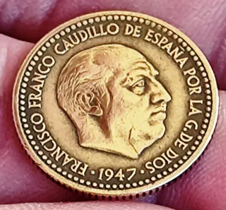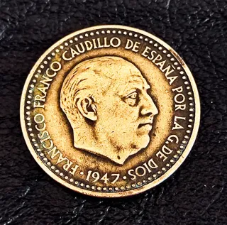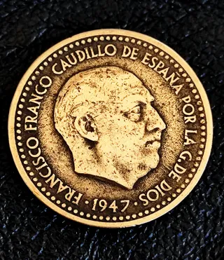 Moneda de 1 Peseta del año 1947, con la efigie de Francisco Franco. Estrella *51 - Canto con puntos. - Inscripción: FRANCISCO FRANCO CAUDILLO DE ESPAÑA POR LA G. DE DIOS 1947.