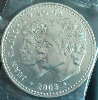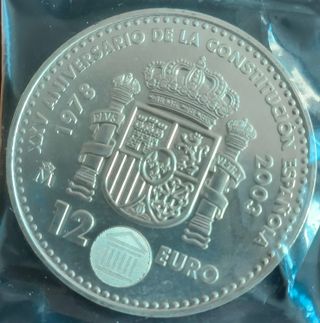 Moneda conmemorativa de 12 euros de plata emitida por España en 2003, para celebrar el XXV Aniversario de la Constitución Española. Anverso: Presenta el Escudo de España, con la leyenda "XXV ANIVERSARIO DE LA CONSTITUCIÓN ESPAÑOLA" y los años "1978" y "2003". También se indica el valor facial "12 EURO" y la marca de ceca (una "M" coronada). Reverso: En el reverso (no visible en la imagen proporcionada, que es solo del anverso), aparecen las efigies superpuestas de Sus Majestades los Reyes de España, Don Juan Carlos I y Doña Sofía. Composición y Características: Metal: Plata de ley (925 milésimas). Peso: 18 gramos. Diámetro: 33 mm.