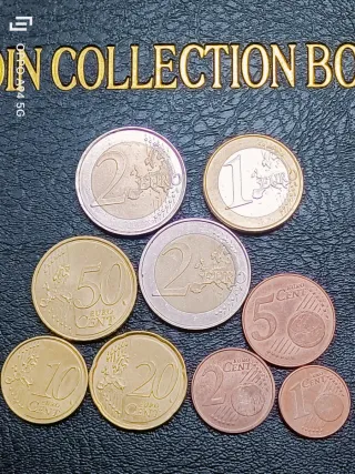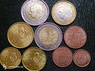 Conjunto de monedas españolas conmemorativas del año 2021. - Incluye monedas de diferentes valores. - Diseño con el retrato del Rey Felipe VI en algunas. - Motivos arquitectónicos en otras. - Acabado en metal dorado y plateado.