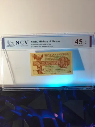 Billete Español, Certificado por NCV, plástico totalmente nuevo, certificados todos por mi, sin rayadas. La descripción del Billete y su calificación aparece en la parte superior de cada billete. ( Primera foto,Certificación ) Terminación del número de serie, 69. Toda la colección de billetes certificados tienen la misma terminación, tanto numeraciones sin serie, con serie, y series especiales. Cualquier duda o consulta, no lo dude! Se envían más fotos si se precisan, se hacen lotes para un mismo envío. Billete de 1 Peseta de la República Española, emitido en 1937. Certificado por NCV con una calificación de 45 Choice Extremely Fi