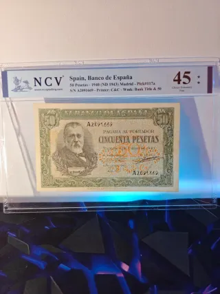 Billete Español, Certificado por NCV, plástico totalmente nuevo, certificados todos por mi, sin rayadas. La descripción del Billete y su calificación aparece en la parte superior de cada billete. ( Primera foto,Certificación ) Terminación del número de serie, 69. Toda la colección de billetes certificados tienen la misma terminación, tanto numeraciones sin serie, con serie, y series especiales. Cualquier duda o consulta, no lo dude! Se envían más fotos si se precisan, se hacen lotes para un mismo envío. Billete español de 50 Pesetas del Banco de España, emitido en 1940 y certificado por NCV con una calificación de 45 Choice Extrem