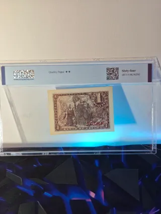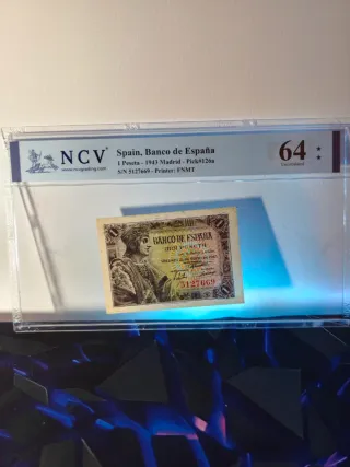 Billete Español, Certificado por NCV, plástico totalmente nuevo, certificados todos por mi, sin rayadas. La descripción del Billete y su calificación aparece en la parte superior de cada billete. ( Primera foto,Certificación ) Terminación del número de serie, 69. Toda la colección de billetes certificados tienen la misma terminación, tanto numeraciones sin serie, con serie, y series especiales. Cualquier duda o consulta, no lo dude! Se envían más fotos si se precisan, se hacen lotes para un mismo envío. Billete español de 1 Peseta, emitido por el Banco de España en 1943 en Madrid. Certificado por NCV con una calificación de 64 Unc